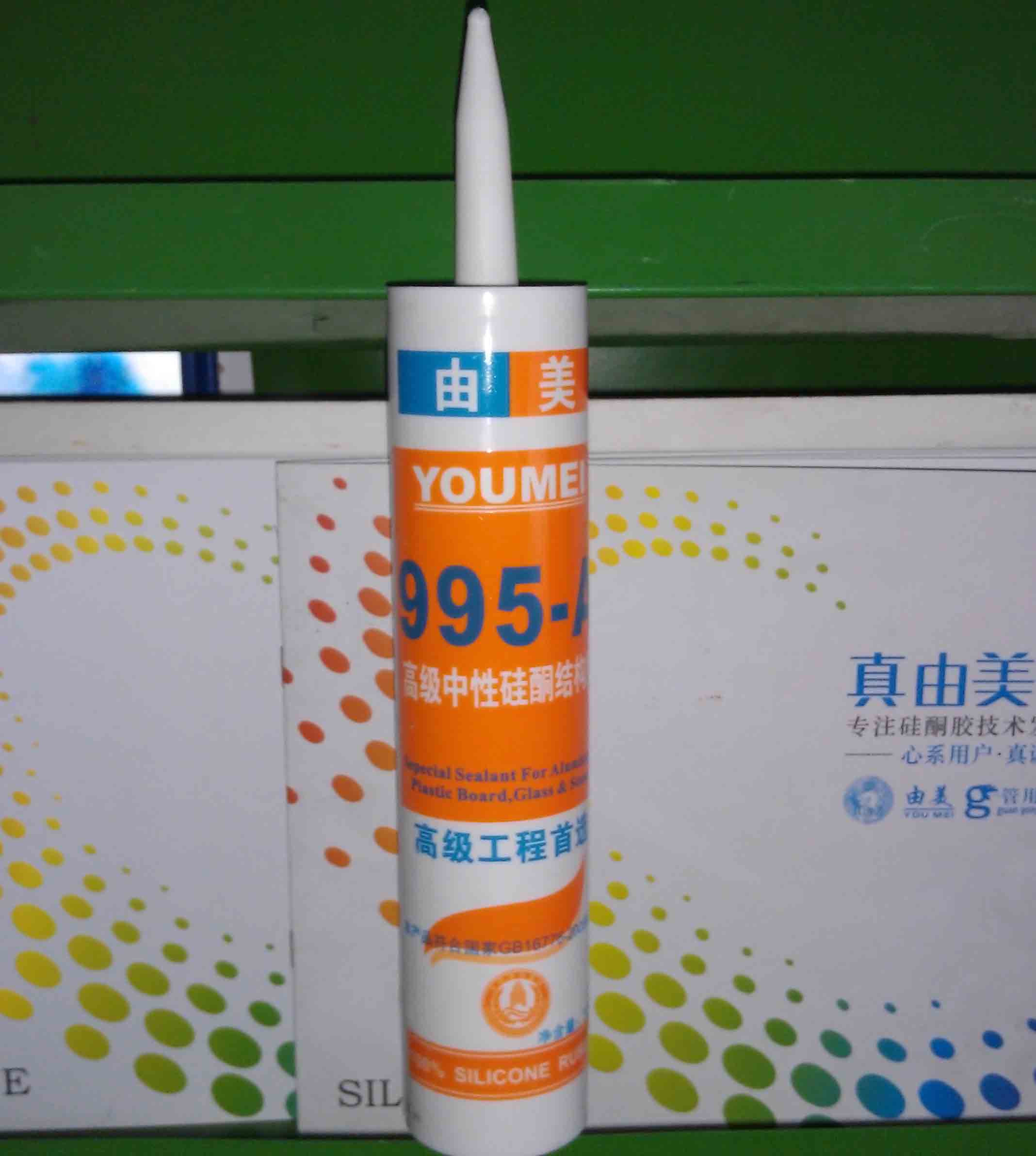 995-A高级中性硅酮结构胶 ※产品说明: 本品为单组份、中性、室温固化建筑结构用硅酮结构密封胶。可以方便 地挤出进行施工,并与空气中的水份发生反应,固化成具有耐寒、耐热、 无腐蚀的弹性体,具有耐臭氧、耐紫外线等优越的耐气候性能,赋予其 长久的使用寿命。在通常情况下无需底涂,固化后对大多数建材,如玻 璃、铝材、钢材和石材等表面均能产生良好的粘接力。 ※基本用途: 1.用于玻璃幕墙的结构性粘接装配,它能将玻璃直接和金属构件表面连 接构成单一装配组件,满足全隐或半隐框幕墙设计要求。 2.中空玻璃的结构性粘接密封。 ※使用限制: 不能在潮湿表面施工或长期浸入水里;不宜用于所有含油或渗出物的表 面;不宜用于结霜或潮湿的表面;基材表面温度低于4℃或超过40℃不宜 施工;不宜用于需要上油漆的表面,因漆膜会龟裂或剥落。 ※注意事项: 密封胶施工场所应特别注意保持良好的通风环境;置于儿童不能触及的 地方,以免误食;如眼睛不慎接触到未固化胶粘剂,应及时用大量清水 清洗并向医生求助。 ※贮存期: 保持原密封状态贮存于27℃以下阴凉干燥处,保存期为自生产日起9个月。 ※主要技术指标